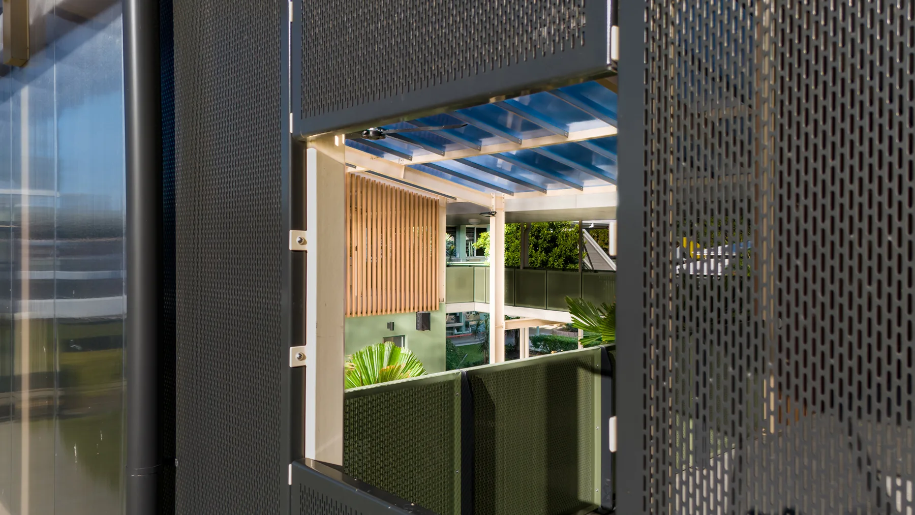 These outdoor learning areas form a new connection between existing General Learning Area buildings, improving weather-protected circulation and integrating the new facility seamlessly within the broader campus.